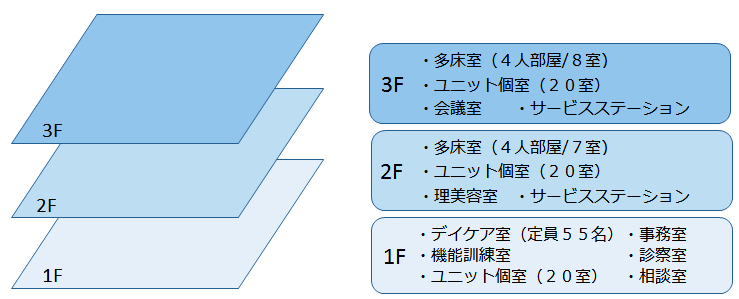 15室 個室 (ユニット型) 60室 入所定員 120名 |